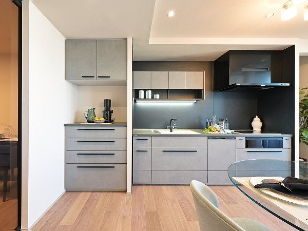 壁付けのキッチンにはグレーカラーをチョイス。メインルームの空間に自然に溶け込みながら、さりげない存在感を放っています。料理をしながら家族の様子も感じられ、コミュニケーションを楽しみながら家事をこなせますよ◎