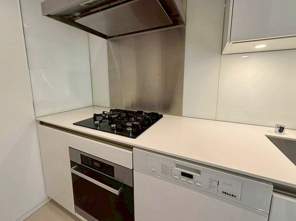白を基調とした約4.4帖のキッチンは、清潔感と機能美を兼ね備えた空間。未使用のMiele社製食洗機・レンジ・オーブンを備え、本格的なお料理にも対応します。背面には大型カップボードが設置され、食器や調理家電の収納にも困りません◎
