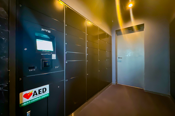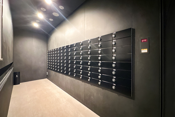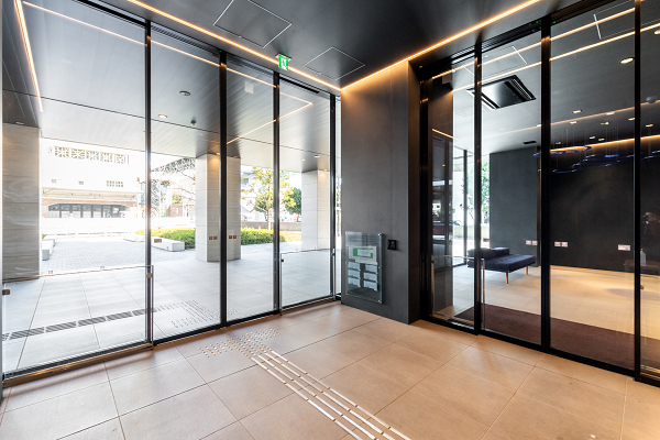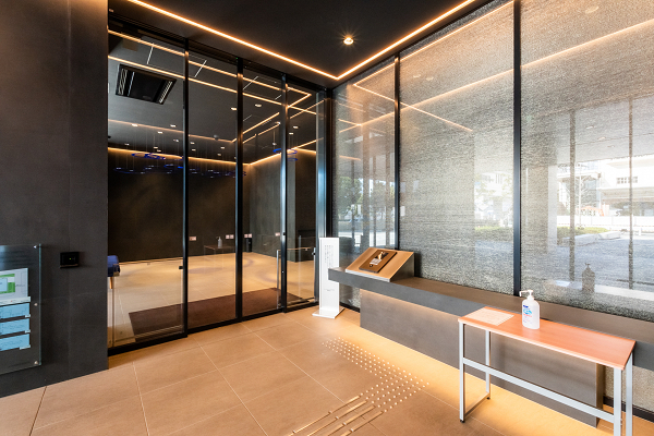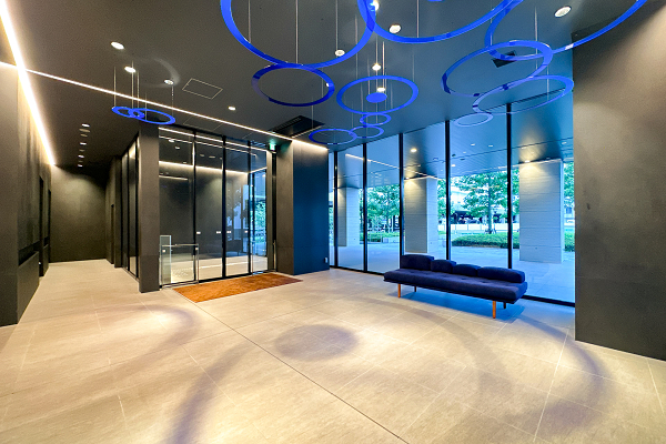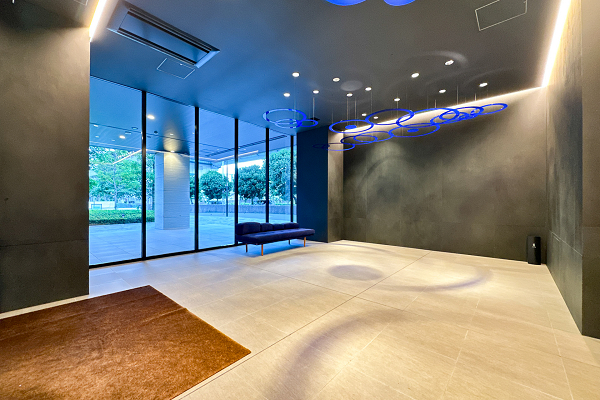オートロックの先にはデザイン性溢れるオシャレな雰囲気のロビーが広がっていました。天井には水紋をイメージした美しいライトが取り付けられていたり、ソファが置いてあったりとホテルライクな雰囲気が漂っています。