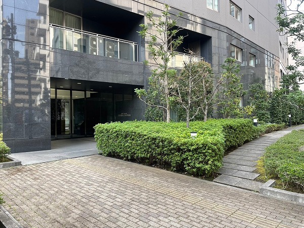 キレイに手入れされた植栽が目を惹く北側のエントランス。オートロックが完備されていてしっかりとセキュリティ対策がなされています。