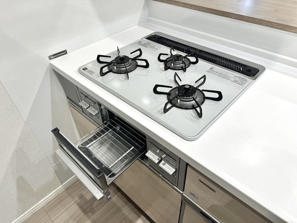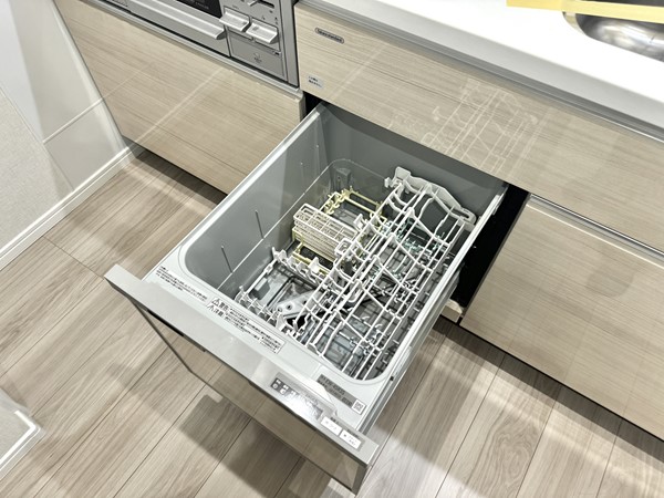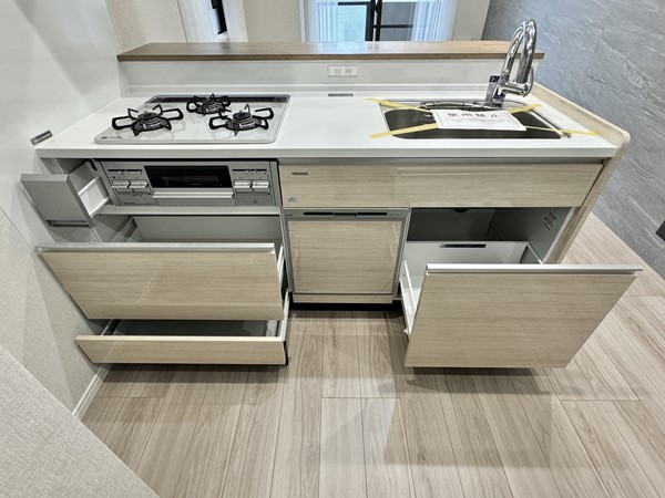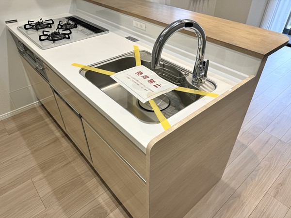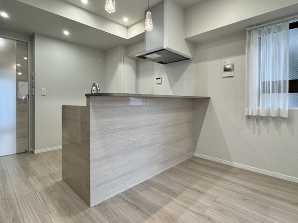キッチンは見通しの良い対面型のレイアウト。フローリングに似た明るい木目調のデザインが採用され、空間によく溶け込んでいます。背面には扉付きの収納に加え、冷蔵庫やカップボードを設置できるスペースが確保されていました。