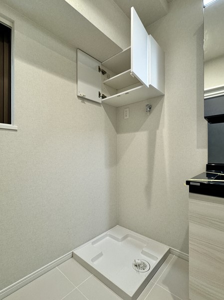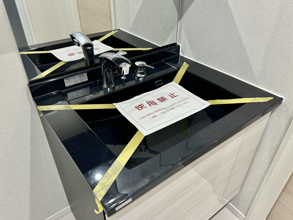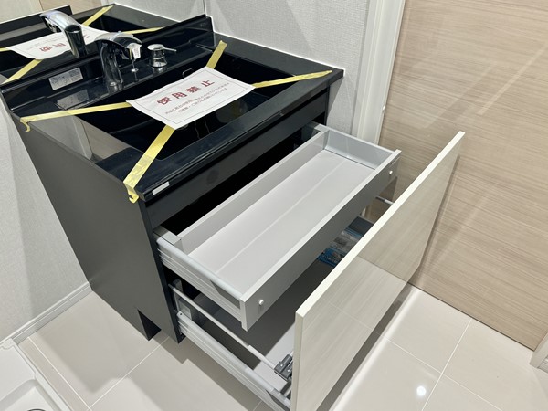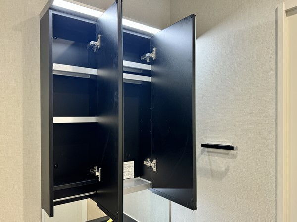 淡いグレーにつ包まれた洗面室。窓枠や洗面ボウルのブラックが締め色となり上品な空間を演出していますね。洗面化粧台には合わせ鏡としてもご利用いただける3面タイプのミラーキャビネットが完備され、お仕度をスムーズに行うことが出来るのではないでしょうか。
