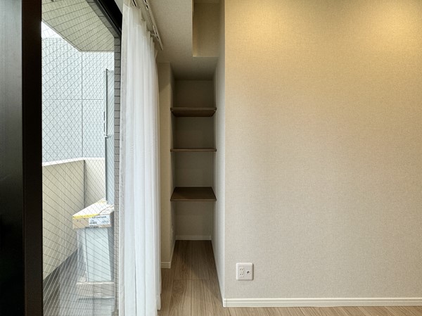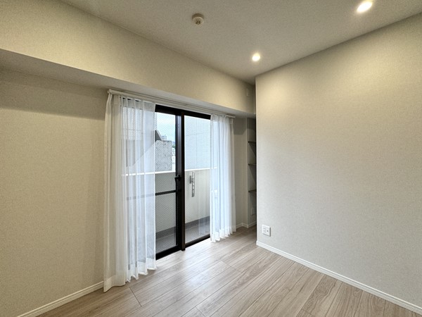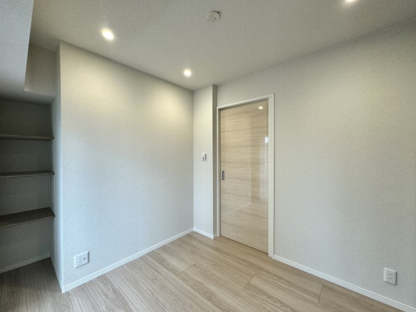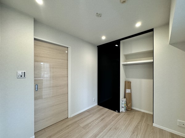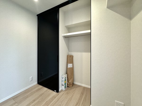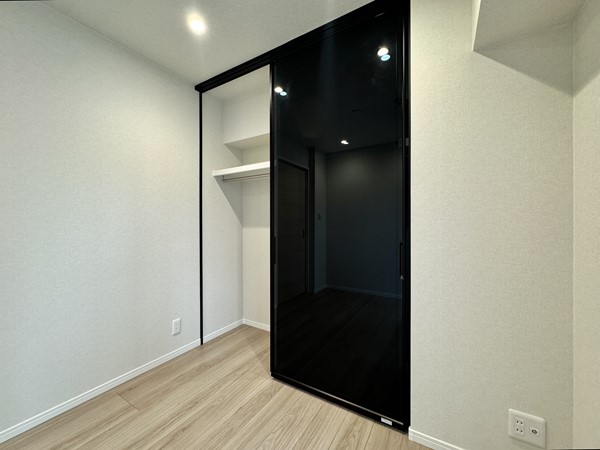 こちらはおよそ4.4帖ほどの洋室。シースルーのブラックの扉がお洒落なクローゼットが取り入れられていました。更に、窓に向かって右手にはオープンシェルフが設置され空間を無駄なく利用できるように配慮された構造です。