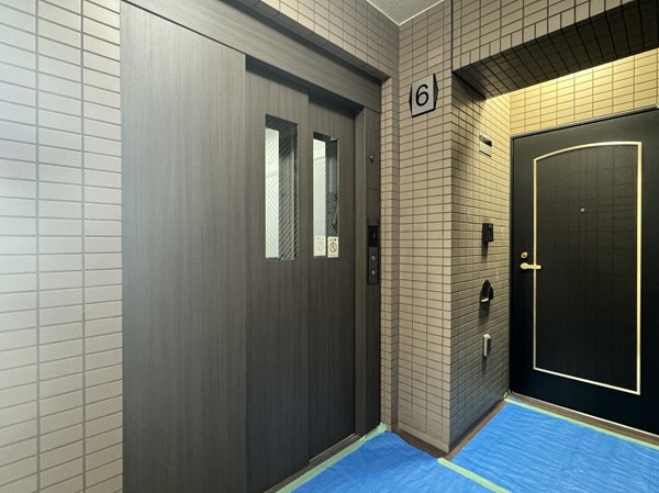 エントランス前には屋根があるスペースがあり、天気の悪い日も落ち着いて雨具の出し入れが出来そうです。入口は二重ドアとなっていて、ブラウンの重厚感あるスイングドアを抜けると、中にオートロックを完備した自動ドアがありました。