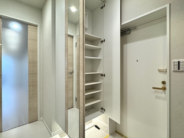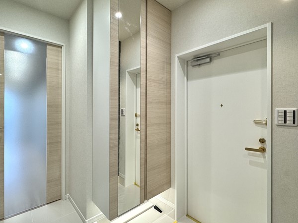 タイル貼りの白い床と、グレーのアクセント壁のコントラストが素敵な玄関。シューズクロゼットの扉には姿見が取り入れられ、お出掛け前に身だしなみチェックすることができて便利◎