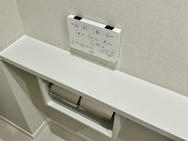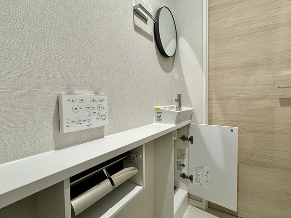 トイレはワントーンでまとめられたオシャレで清潔感のある空間に仕上がっていました。独立した手洗いカウンターが完備され衛生的なのも嬉しいポイント。丸いミラーが素敵ですよね。