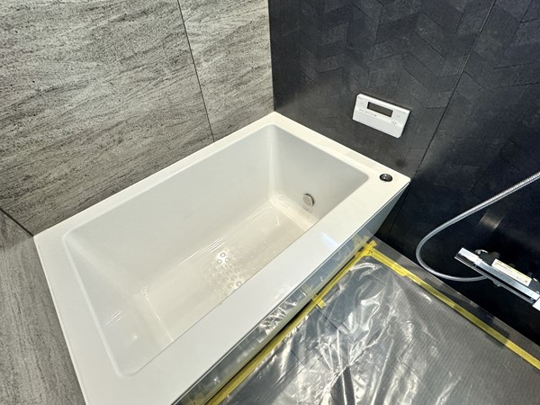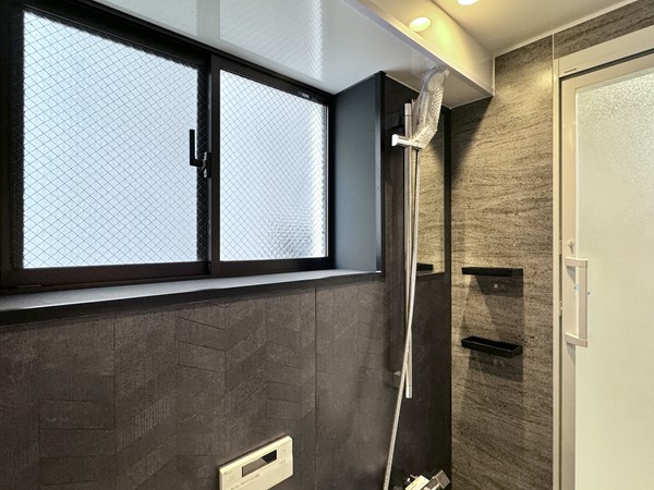 バスルームには2種類のストーン調の壁が取り入れられ重厚感のある雰囲気に。小窓が設けられているおかげで閉塞感が和らげられており、のびのびとしたバスタイムをお楽しみいただけそうです。