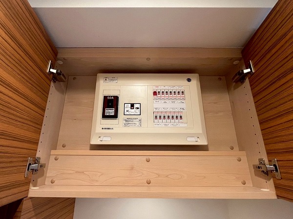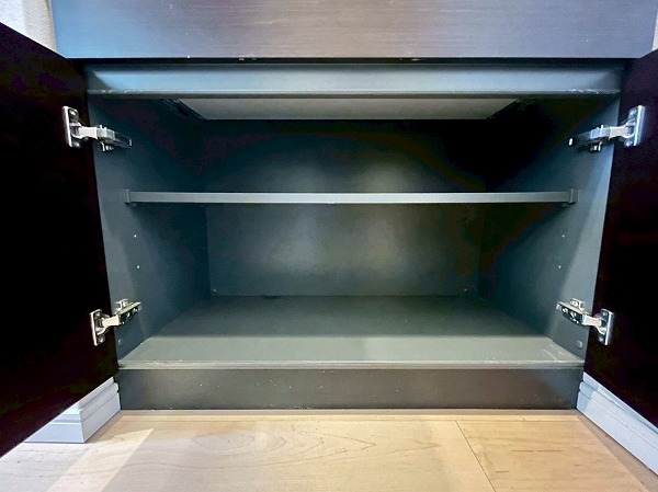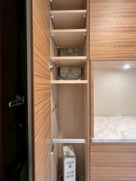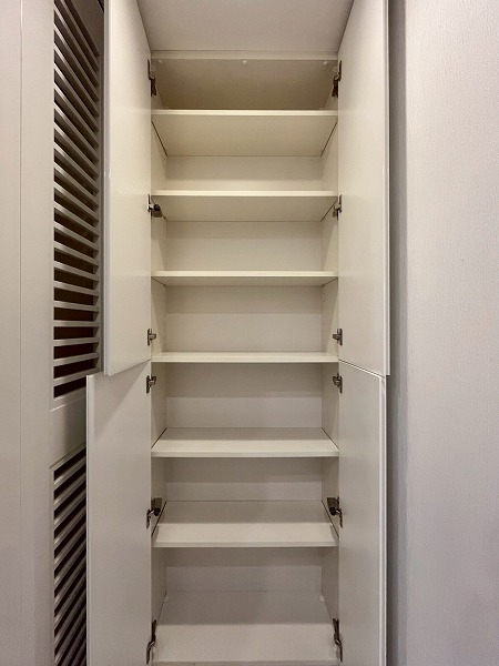 玄関には大きなシューズクローゼットに加え、もう一つ扉付きの収納がありました。いずれも棚板の高さを調整することが出来るので、スペースを無駄なく活用することが出来そうです。全体的に収納が豊富となっており、人によっては追加で収納家具を設置しなくても済みそうでした。