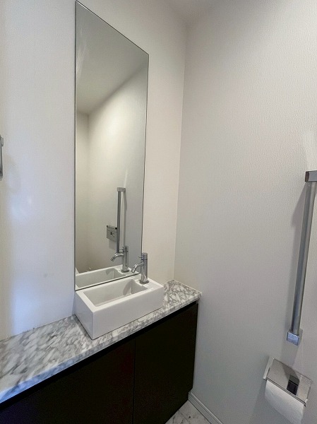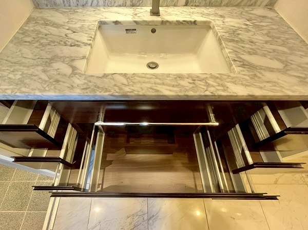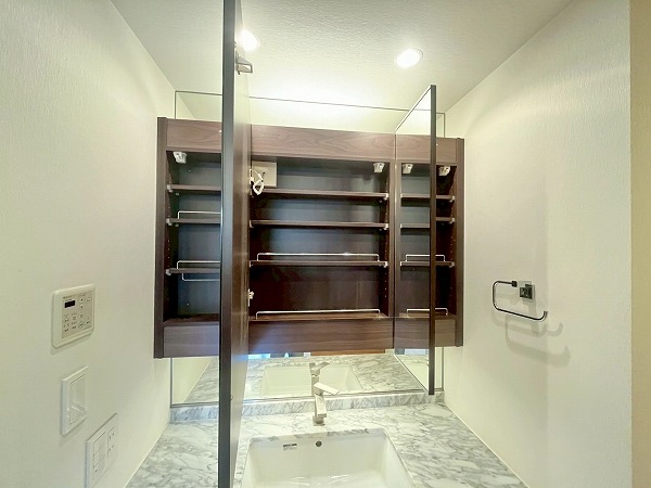 サニタリールームには水回りを集約し、家事動線がスムーズに整えられていました。収納付きの洗面化粧台は使い勝手が良く、生活感を上手に隠せます。横に設けられたカウンターは、朝の準備やスキンケアタイムをゆったりとサポート。