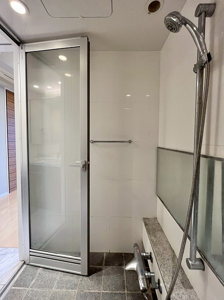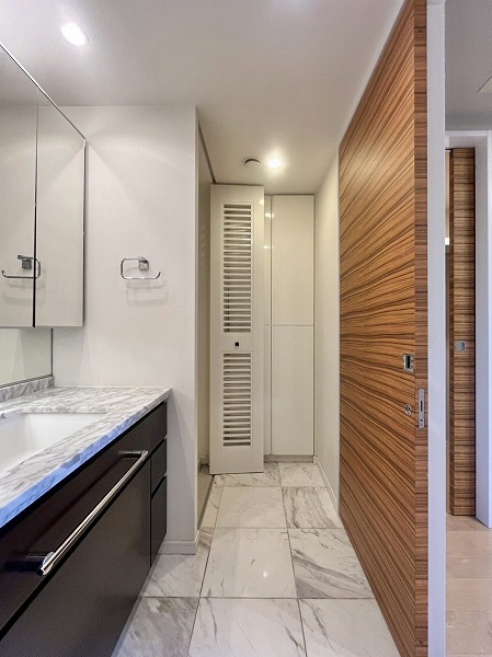 サニタリールームには、洗面化粧台、ランドリー、バスルームと、大きなリネン庫が備わっていました。バスルームの扉は透明なガラスとなっており、まるで海外のホテルみたいですね。ナチュラルながら、どこか高級感を感じる上品な空間です。