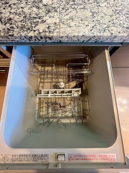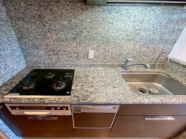 約3.4帖のキッチンはゆとりのある設計。グリル付き3口コンロを備え、自炊派の方にも満足いただける設備が整っています。ビルトインタイプのコンロは見た目もすっきりとしており、お手入れも簡単。さらに食洗機も完備され、毎日の後片付けをしっかりサポート◎