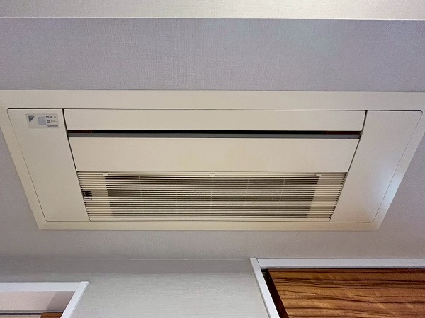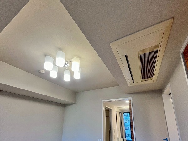 およそ6帖の洋室には、バルコニーに繋がる大きな窓が設けられ、開放感溢れる空間となっていました。ビルドインタイプのエアコンがメインルームに2基、洋室に1基設けられているため、一年中快適にお過ごしいただけるのではないでしょうか。