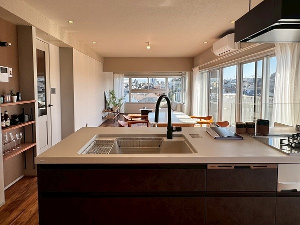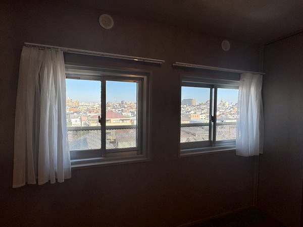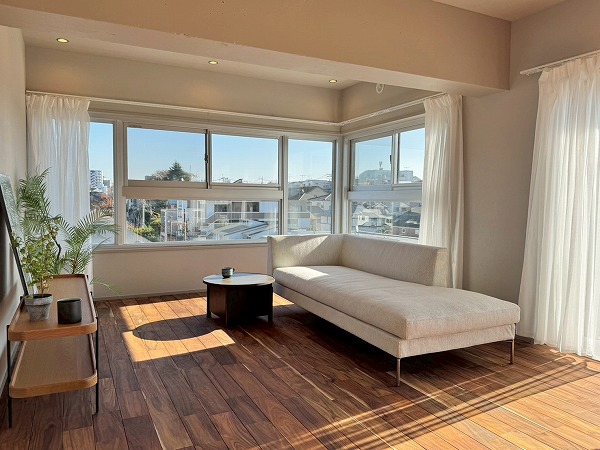 メインルームは、大きなコーナー窓があります。晴れた日は陽がたくさん入り、冬場でも暖かく過ごせそうでした!また約23帖と贅沢な広さで、圧迫感がなくなり、快適的でのびのびと過ごせます。