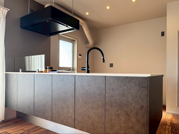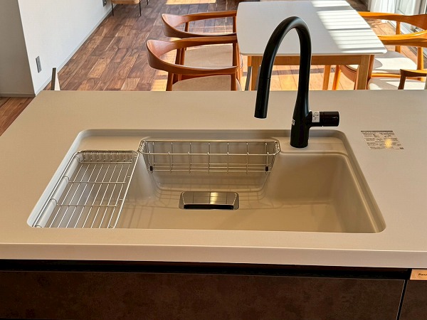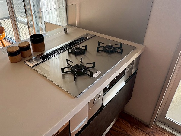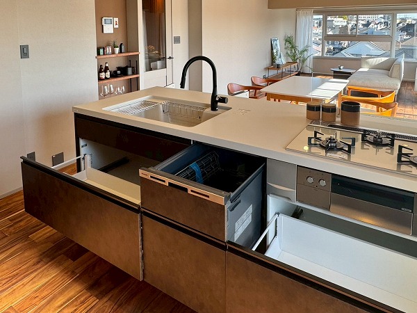 キッチンはペニンシュラ型で、開放感が抜群です。さらに食洗機や浄水器、グリル付き3口コンロが完備されており、毎日の料理の時間を快適にしてくれる設備が揃っています。シンクが広いところも嬉しいポイントですね☆