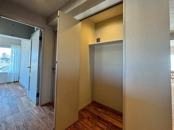 約7.0帖のお部屋には、ウォークインクローゼットとインナーバルコニーが備わっています。ウォークインクローゼットは横長のタイプで一目で全体を見渡せて探しやすい仕様となっていました。