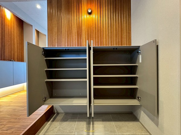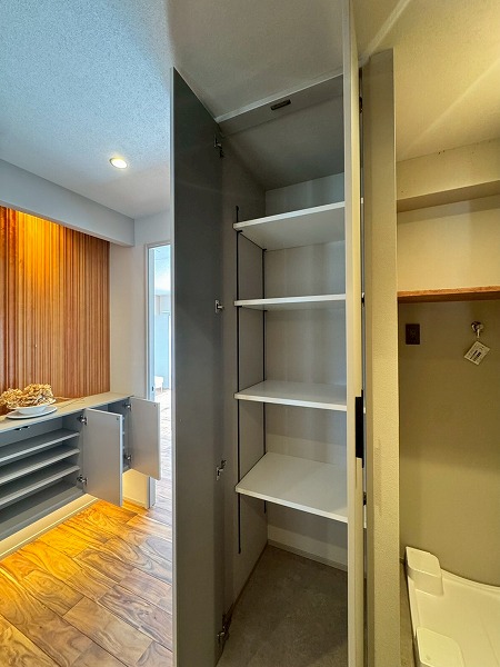 デザイン性の高い印象的な窓を備えた約6.3帖のお部屋には、土間スペースがあります。玄関から直接土間に行くことができるため、収納としてはもちろん、趣味の作業場として使ったり、ベビーカーをそのまま置いておくことも可能です。