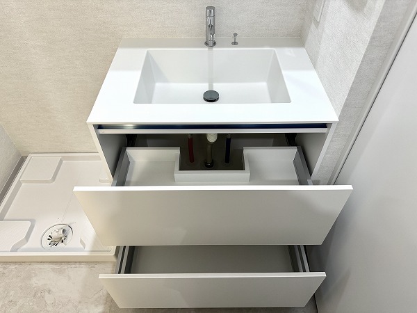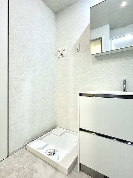 サニタリールームをチェックしましょう✦洗面化粧台と洗濯機置き場が並んでいて、洗濯物の予備洗いもしやすいです。洗面化粧台はミラーキャビネット仕様になっていて、使いたい洗面道具をパッと取り出せますよ◎収納力もあって助かりますね♩