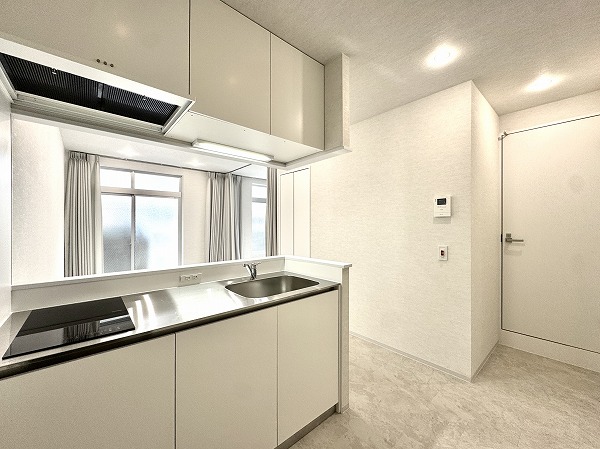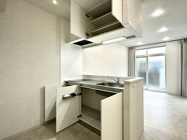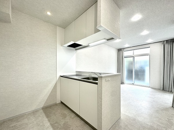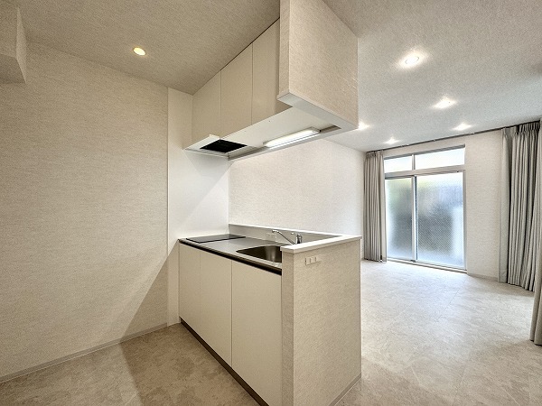 リビングダイニングキッチンは約8.8帖。カーテンによる空間分割なので、カーテンを開けて大きなワンルームのようにしたり、暮らし方に合わせた柔軟な使い方が可能です♫明るいトーンでまとめられていてなんだか広く感じます◎