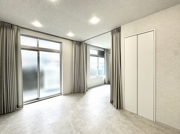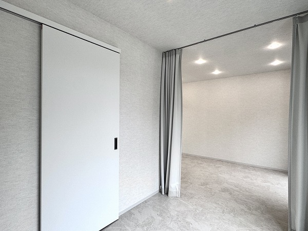 ご紹介したのは1階部分の1LDK、専有面積32.93㎡のお部屋。室内はフルスケルトンからリノベーションが施され、白を基調としたやわらかなトーンでまとめられています。こちらの住居の一番の特徴は、リビングと洋室はカーテンでゆるやかに仕切るつくりになっているということ。完全に空間を区切ることをせず、暮らし方に合わせて空間を調整できる自由度が魅力的ですよね。3面にハンガーパイプが設けられた大容量のウォークインクローゼットが備わっているため、生活空間をすっきり保ちやすい設計になっているのも嬉しいポイント◎
