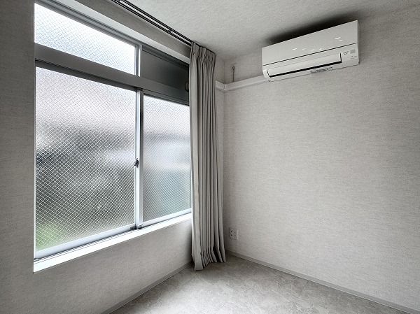 ベッドルームは約3.4帖とコンパクトですが、仕切りのカーテンを開けて開放的にお使いいただけます◎エアコンが備わっているので、引っ越ししてきたその日から快適に過ごせますね♩初期費用も抑えられて嬉しい♡