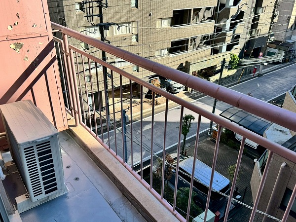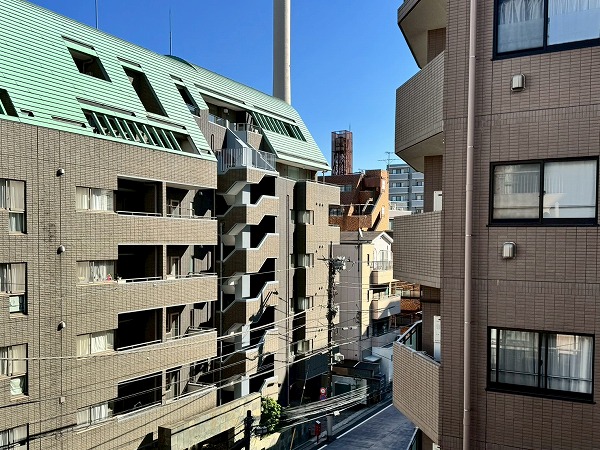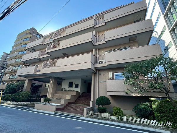 鉄筋コンクリート造地上7階建ての『朝日第2中目黒マンション』。ベージュカラーの重厚感のある外観で存在感がありました。植栽がマンションを囲み、落ち着いた雰囲気です。