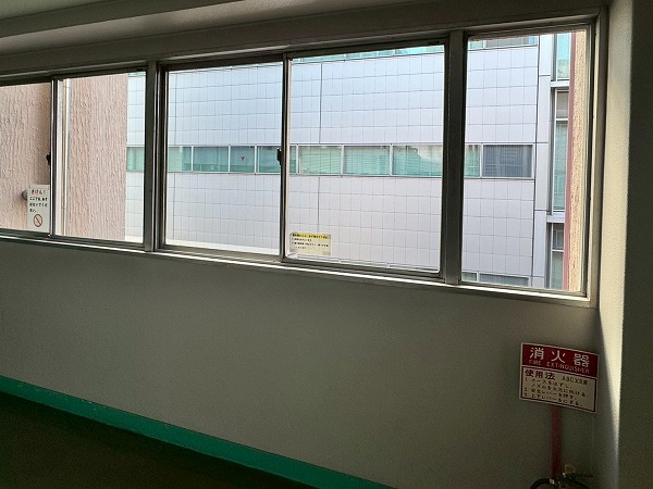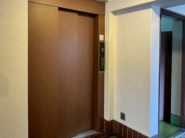 マンションのエントランスは手動でドアを開ける仕様です。すぐに管理人室があるため、防犯面で安心ですね。床は特徴的な深いブラウンカラーで、落ち着きのある空間が広がっていました。