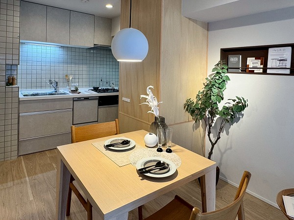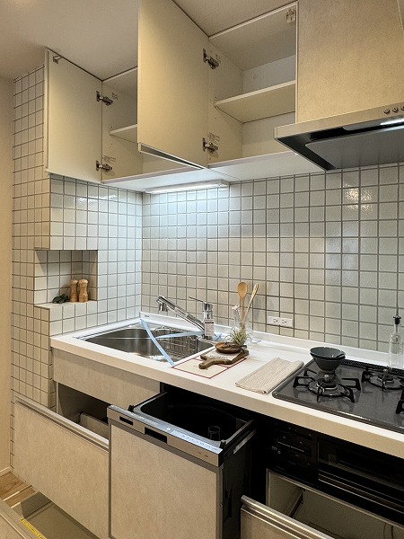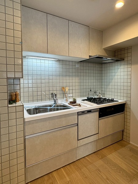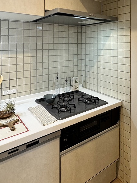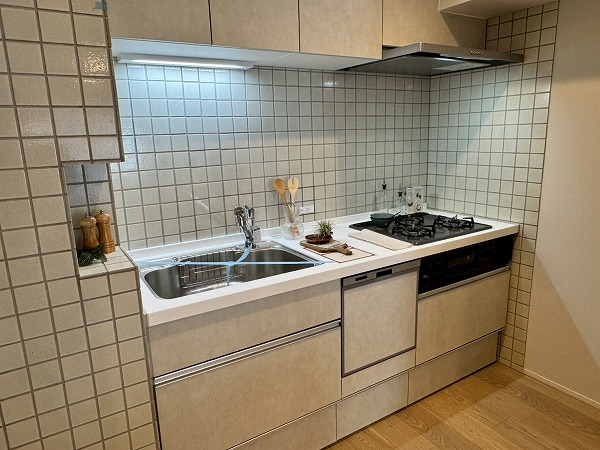 お洒落なタイルが印象的なキッチン。ニッチがあり、調味料を置いておくのに便利です。浄水器付きのため、綺麗な水をお気軽にご利用いただけますよ。さらにグリル付き3口コンロ、食洗機が完備されており、効率よく料理ができますね。冷蔵庫置場が隠れた仕様になっているため、生活感が出ないも嬉しいポイントですね♪