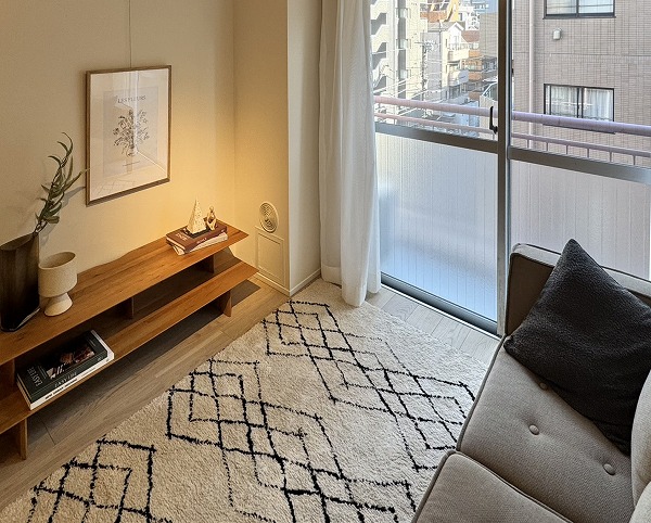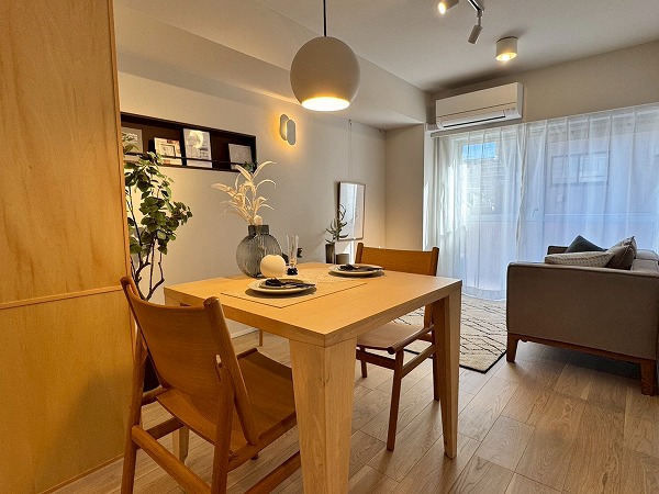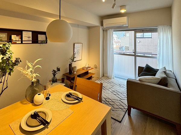 今回ご紹介するお部屋は、デザイン性の高い1LDK。2025年10月にフルリノベーションが完了され、新築のような綺麗さでした。明るいカラーの木目のフローリングとホワイトカラーのクロスで爽やかな印象ですね。