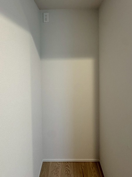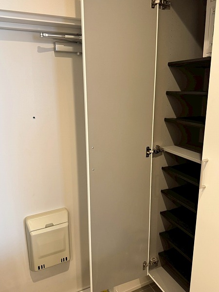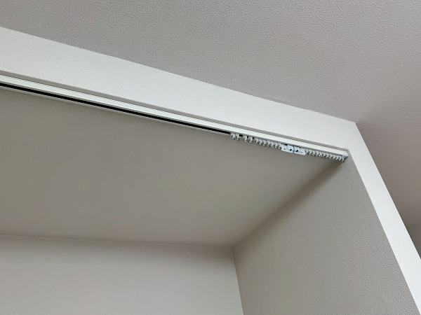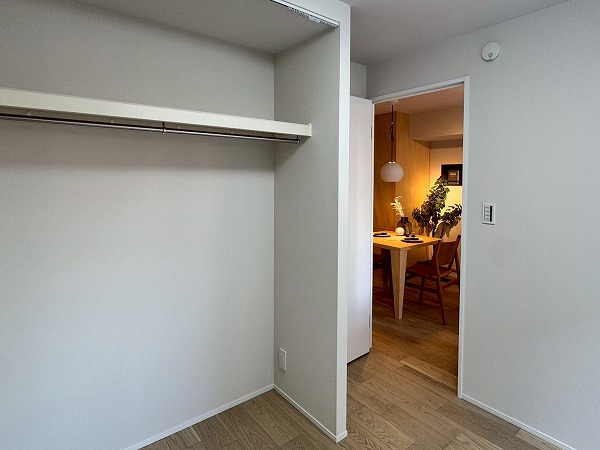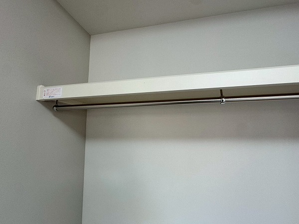 約4.9帖の洋室にあるクローゼット。オープンタイプとなっていますが、カーテンレールが備わっているため、隠す収納にすることもできます。オープンタイプのクローゼットは、出し入れがしやすく、収納している物が一目で分かるのが特徴です。しかしカーテンをすることで、急な来客時でも、生活感を隠すことができ、日焼け防止対策にもなります。オープンタイプとクローズドタイプそれぞれの良さを引き出すことができますね。