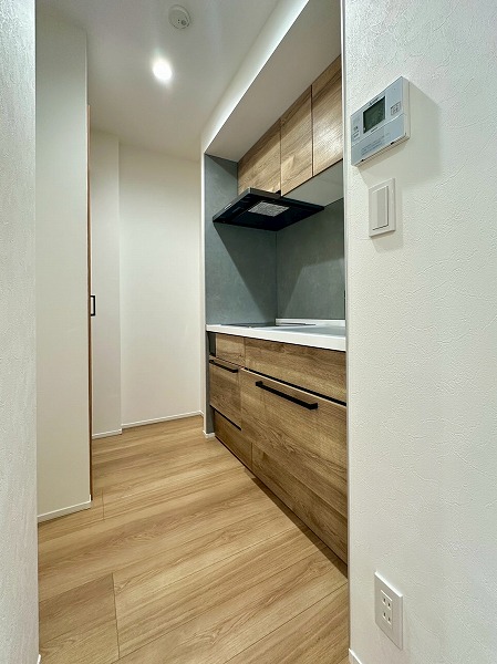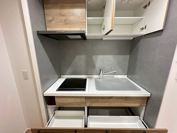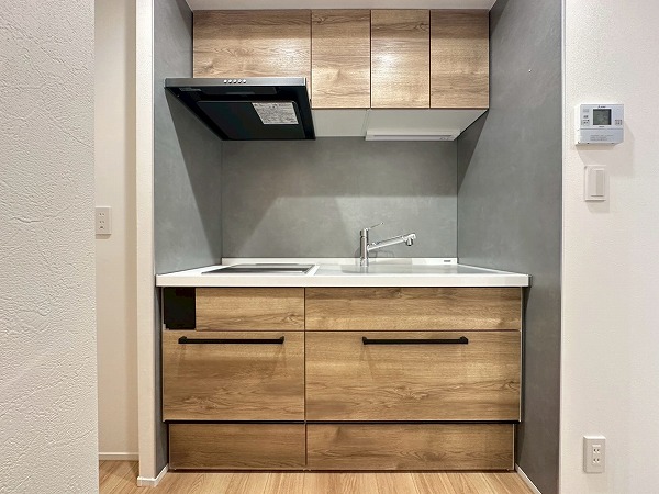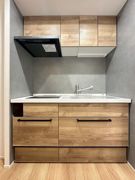 木目が映える独立型システムキッチンは、空間に温かみをプラス。IHコンロを備えたオール電化仕様で、安全性とすっきりとしたデザイン性を兼ね備えています。調理後のお掃除が簡単なのも嬉しいポイント♪