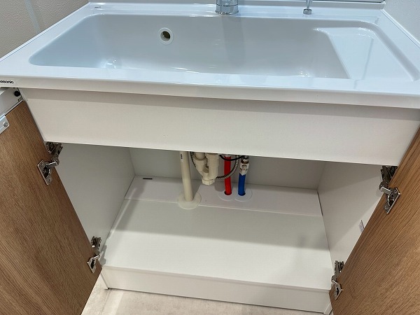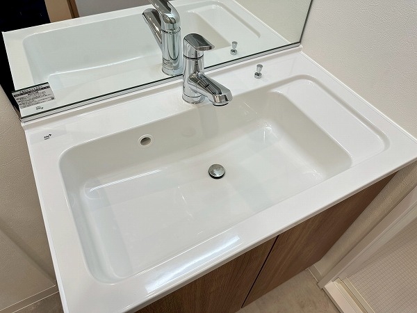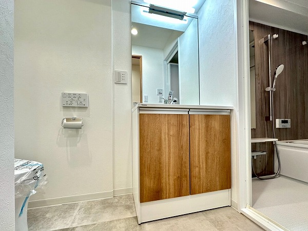 洗面化粧台・トイレ・浴室がひとつの空間にまとめられたサニタリールーム。無駄のない配置で機能美を感じる設計です。洗面台に備え付けられたワイドな鏡面で、朝の支度も快適に行えそうですね。