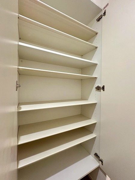 木目とホワイトが調和した、あたたかみのある玄関スペース。大容量のトールタイプシューズボックスは収納力抜群です。姿見付きになっており、お出かけ前の身だしなみチェックもスムーズで、機能性とデザイン性を兼ね備えていますよ。