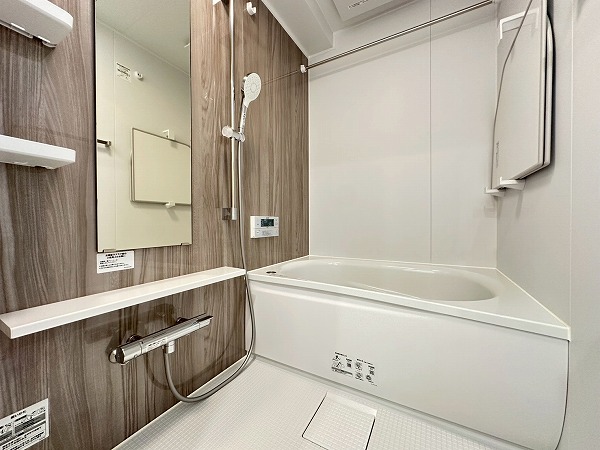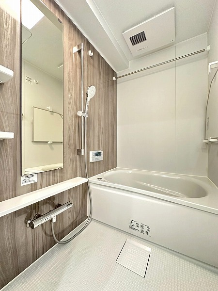 ホワイト×木目調の清潔感溢れるバスルーム。追焚き機能を完備しており好きなタイミングで日々の疲れをゆっくり癒せます♡さらに、便利な浴室乾燥機能も備えており、雨の日でも問題なく洗濯物を乾かすことが可能です。