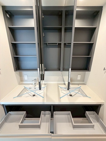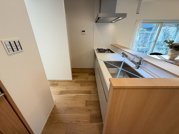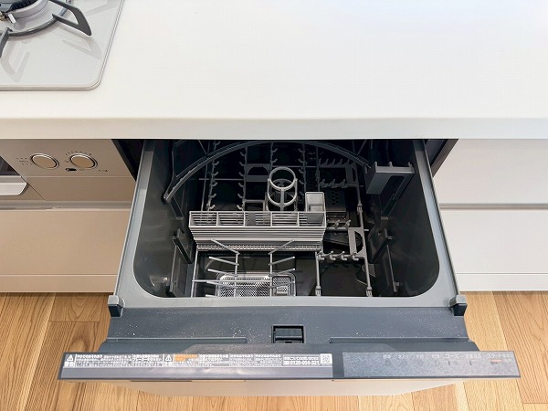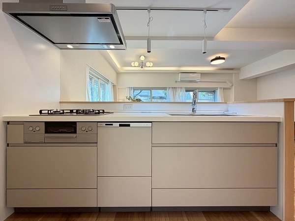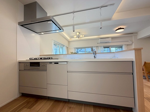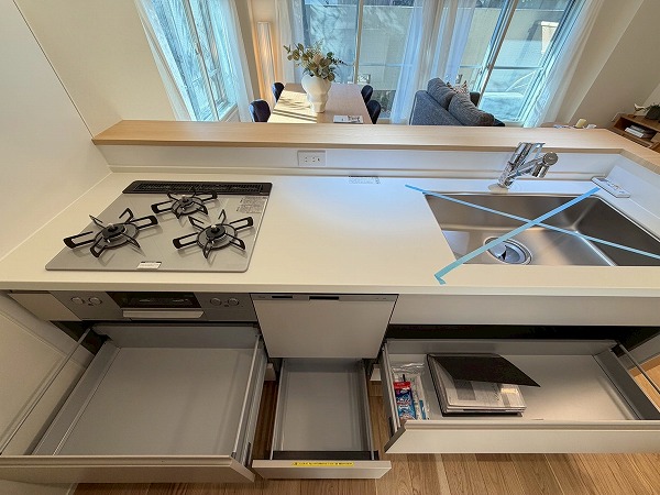 対面式のシステムキッチンは、ご家族や友人が集まりやすい空間を実現♪複数品の同時調理が可能なグリル付き3口コンロ、食洗機、浄水器など便利機能満載で、機能面も充実しています。