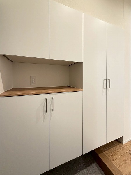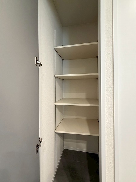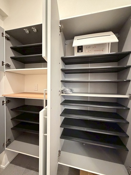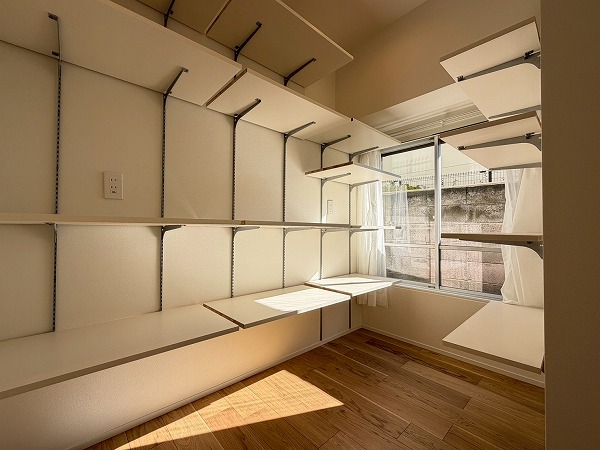 キッチンの奥には、収納力抜群のパントリーが併設されています。可動式棚が採用されているので、大きめの調理器具はもちろん、ストック用の食材や食器類なども綺麗に整理することができます。