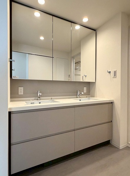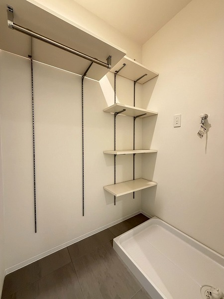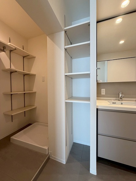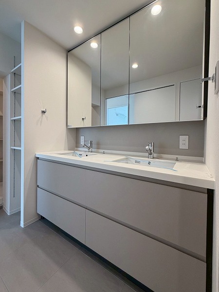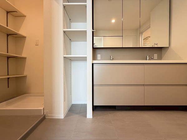 サニタリールームには洗面台・洗濯機置き場・バスルームが集結。水回りの機能がまとまっていると、生活動線もスムーズですよね♪白で統一されたバスルームには、快適なご入浴に欠かせない追い焚き機能&浴室乾燥機を完備。