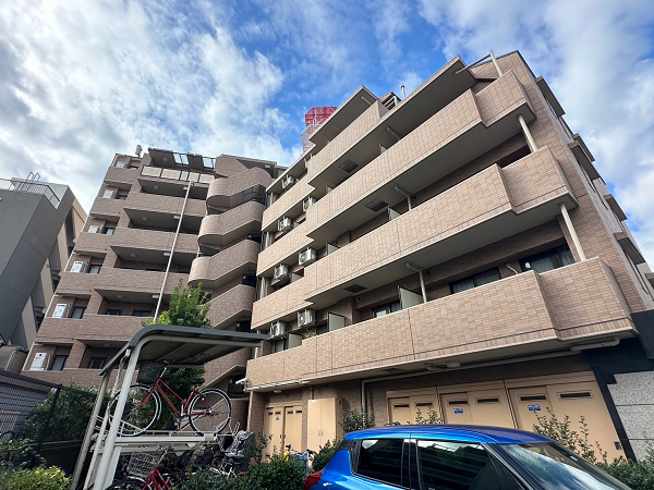 ブラウンタイル貼りが柔らかな印象の7階建てマンション、こちらが『ライオンズガーデン学芸大学』です。総戸数68戸の鉄筋コンクリート造。安心安全の新耐震基準適合マンションです。