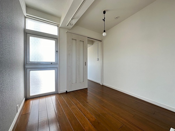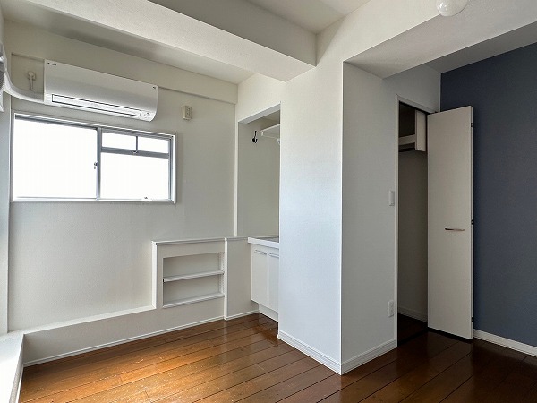 東側に位置する洋室にもエアコンが付いていました。機能面が充実しているのは嬉しいポイントですね。こちらお部屋もベッドを置けるサイズ感なので、寝室としても使用可能。さりげないカラーのアクセントクロスが空間をより立体的に見せてくれていますね。細部にまでこだわり満載な間取り。