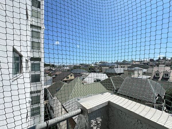 バルコニーは2つの洋室にそれぞれ備わっています。両方ともこぢんまりとしたサイズではありますが、陽当たり&風通し良好。鳥除けのネットが張られていました。高層階につき開放感溢れる眺望をご覧いただけます。
