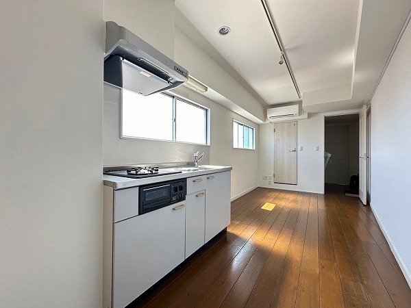 リノベーションが施された、5階部分に位置する2DKのお部屋をご紹介。メインとなるリビングダイニングキッチンは奥行きがあるので、テーブルやソファなどの家具も置けそうです。南向きの窓からはたっぷりの採光が入り、お部屋全体が明るく、ポカポカと温かな雰囲気。窓を開ければ心地良い風が吹き込み、1年中快適にお過ごしいただけます。