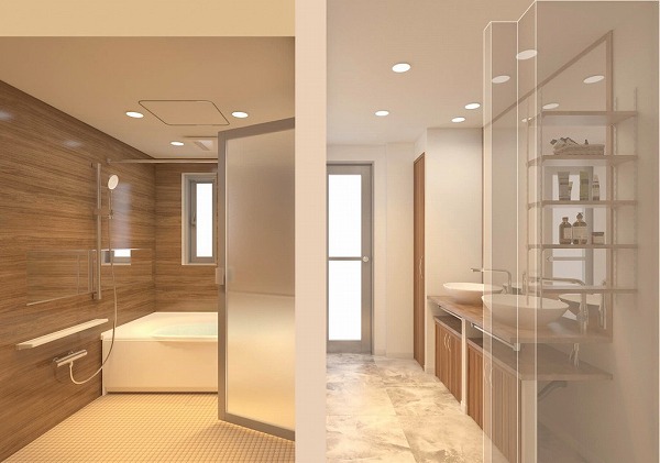サニタリールームには洗面台・洗濯機置き場・バスルームが集結しています。ホテルライクな洗面化粧台には、洗面ツーボウルが備わっているので、忙しい朝の身支度もスムーズです♪