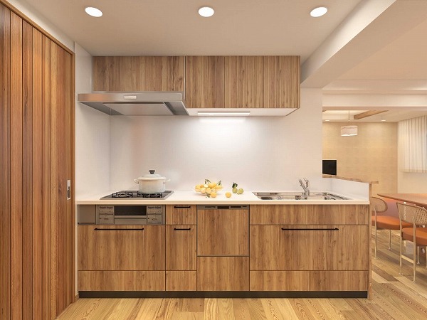 木の温もりを感じられるシステムキッチン。複数品の同時調理が可能なグリル付き3口コンロや便利な食洗機、浄水器を搭載しているので、毎日の家事もスムーズにはかどりそうですね♪