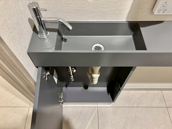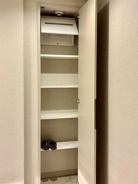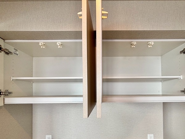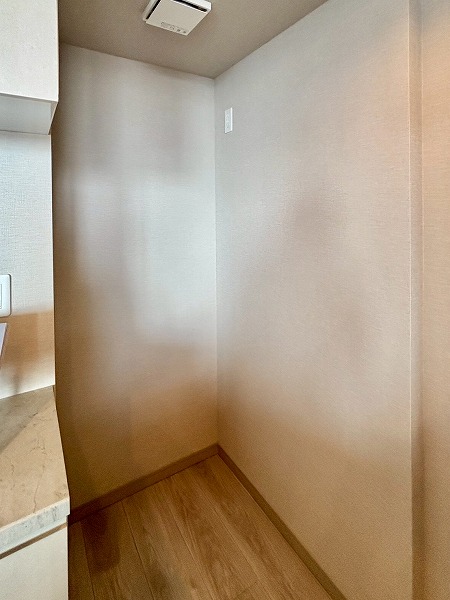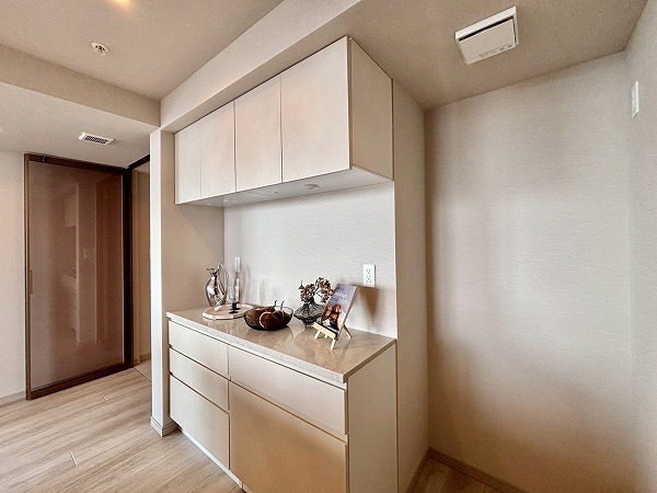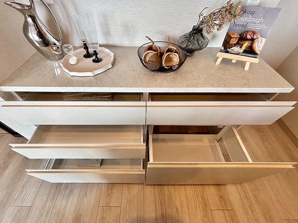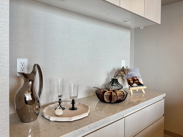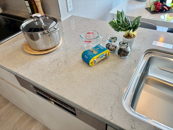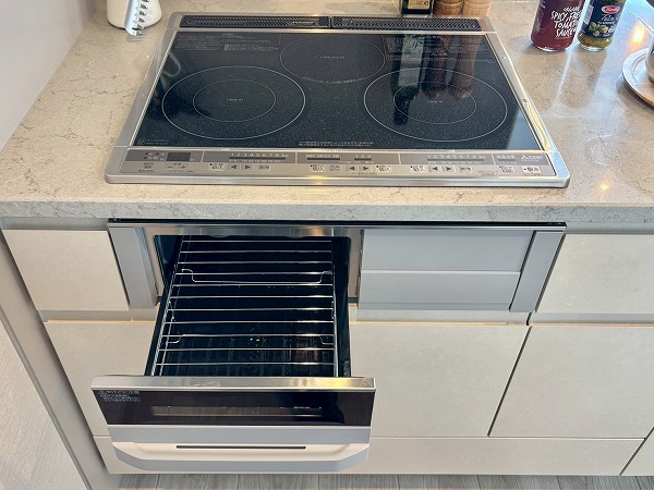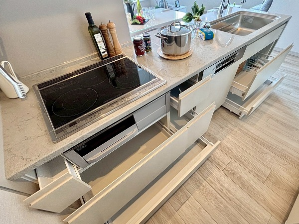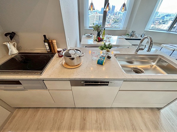 2025年9月に新規リノベーションが実施されており、システムキッチンも新しいものに交換されています。大きく開くフロントオープンタイプの食洗機やIHクッキングヒーターなどを搭載しており、使い勝手が良さそうでした!また、キッチン背面には大きなカップボードもご用意。お皿やカトラリーの保管場所にも困りません。