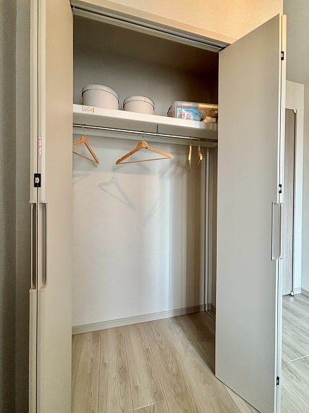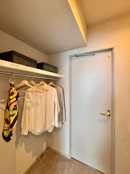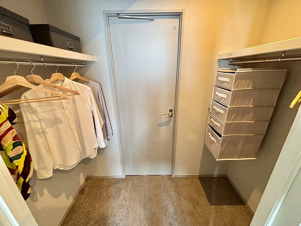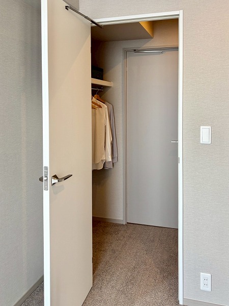私が注目したのはこちらのクローゼット。幅が広くたくさんしまえるのはもちろん、およそ7.9帖の洋室側と、パウダールーム側の2面にドアがあるウォークスルー仕様になっているんです。わざわざ遠回りする手間が省け、スムーズにお出かけできますね!