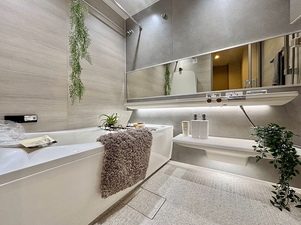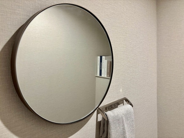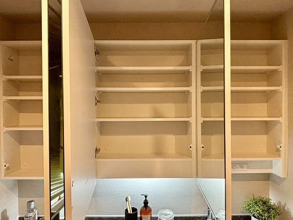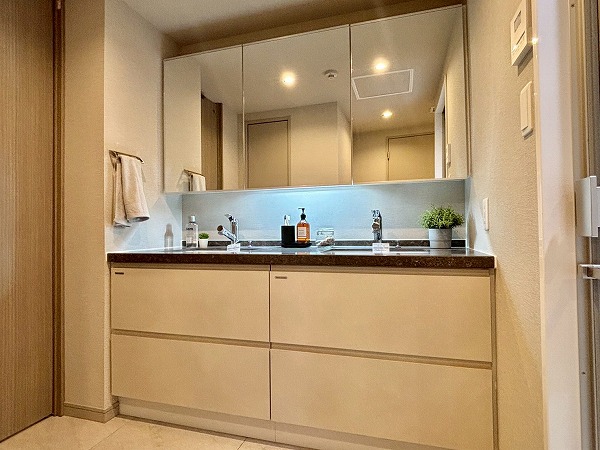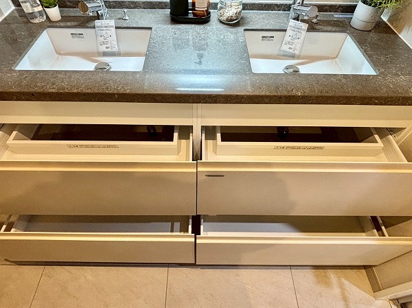 クローゼットを抜け、パウダールームをチェック。L字のような形のゆったりとした空間です。大きなミラーの洗面化粧台は、洗面ボウルが2つ並んだ2ボウルタイプ。ご家族と並んで使用でき、忙しい朝の混雑によるストレスに悩まされません。収納豊富で使いやすそうでした。