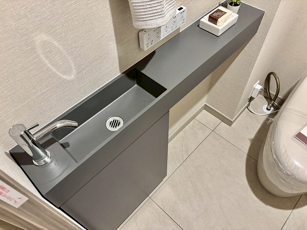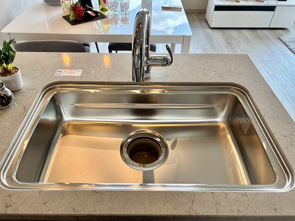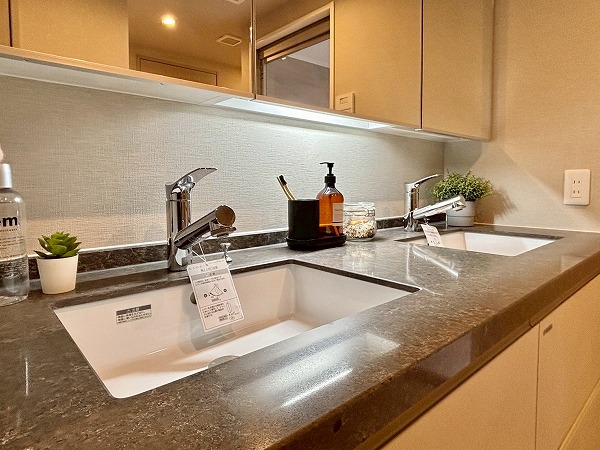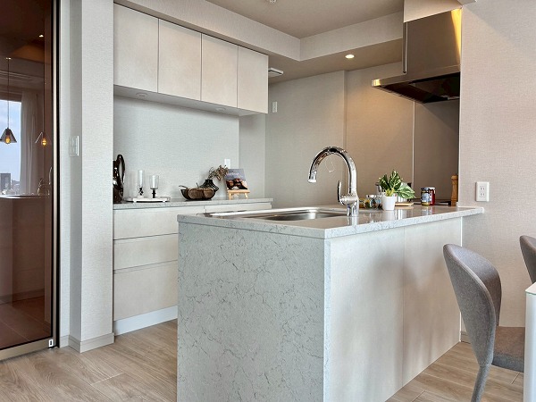 キッチンはメインルームの一角に半個室タイプとして配置され、ご家族で並んで調理できるゆとりある空間です。大理石調の落ち着いたピンクカラーにゴールドの取っ手をあしらった可愛らしいデザイン。IHコンロを採用しており、調理後のお手入れもサッと拭くだけで簡単です。