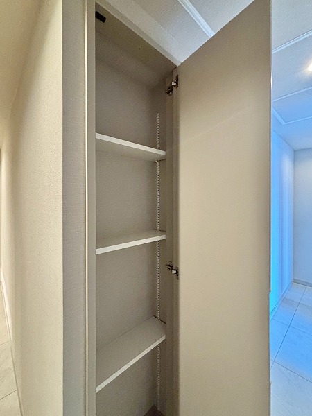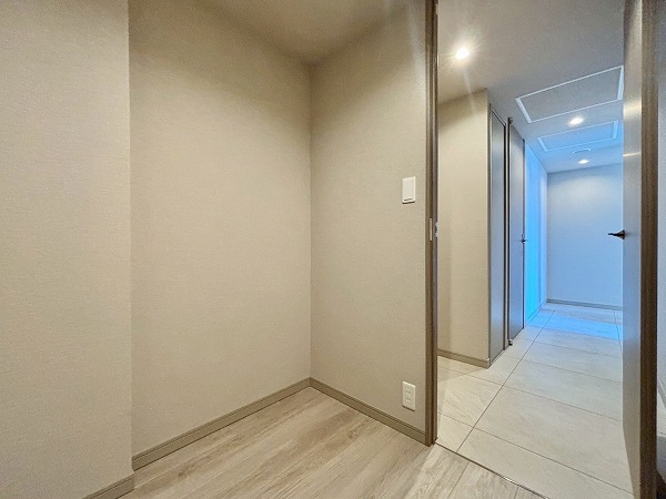 収納が多いのも、今回の3SLDKの魅力の1つ。玄関廊下を進むと、およそ1.9帖のサービスルームが現れました。寝室にはコンパクトすぎますが、物置や書斎など様々な使い方ができそうです。廊下にトランクルームもあり、荷物をたくさんしまえますね。