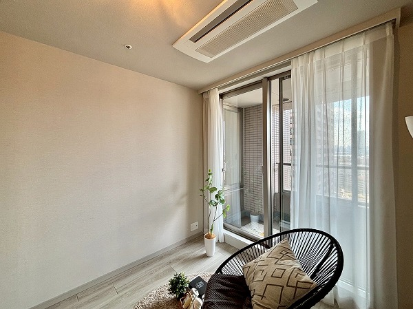 約8.0帖の洋室はバルコニーに面した大きな掃き出し窓を備え、明るく開放的。ベッドなどの大きな家具を置いても十分な広さがあり、主寝室として最適です。さらに約2.0帖のウォークインクローゼットを完備しており、衣類はもちろんスーツケースやシーズンオフの家電もすっきり収納可能。収納力の高さも魅力です。