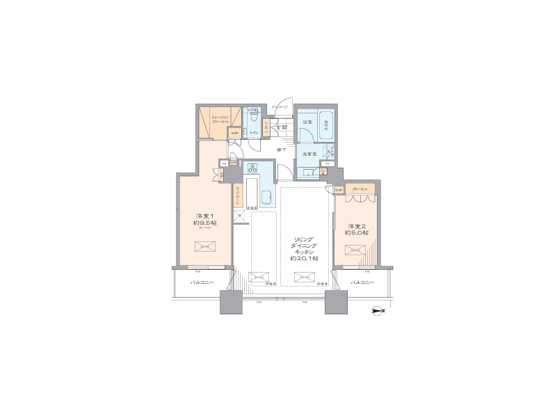 約8.0帖の洋室はバルコニーに面した大きな掃き出し窓を備え、明るく開放的。ベッドなどの大きな家具を置いても十分な広さがあり、主寝室として最適です。さらに約2.0帖のウォークインクローゼットを完備しており、衣類はもちろんスーツケースやシーズンオフの家電もすっきり収納可能。収納力の高さも魅力です。