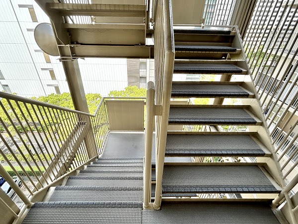 外廊下はワイドなコの字型です。これだけ広さがあるので、お部屋の位置によってはエレベーターまで向かうのに時間がかかります。敷地内に外階段が2つ備わっているので、お急ぎの際は階段で行き来することも可能です。